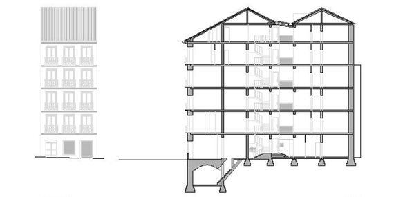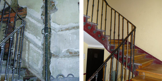 Proyecto de consolidación estructural parcial destinado a reparar daños de muy diversa índole en un edificio de viviendas del siglo XIX localizado en el centro de Madrid.