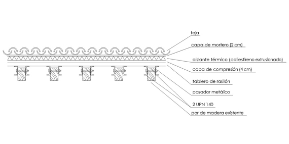 La cubierta había sido objeto de una reciente rehabilitación, pero debido a una mala ejecución de la misma, se hizo necesario levantar uno de los paños de la cubierta, reforzando la cercha de madera estructural y corregir así el alabeo existente.