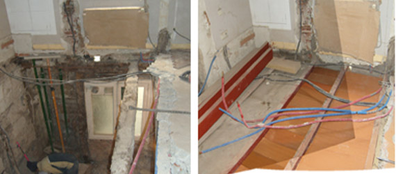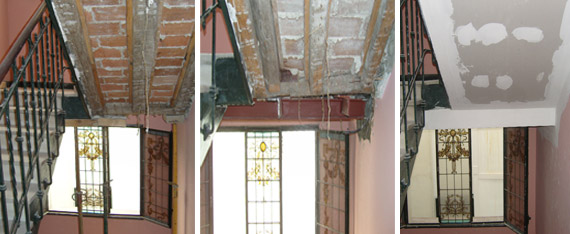 Los forjados tanto en cocinas como en baños se encontraban deteriorados debido a las pérdidas producidas por el saneamiento con la consiguiente pudrición de los elementos de madera y la exposición a agentes xilófagos. Aquellos paños de forjado dañados que pudieron repararse fueron reforzados con elementos de acero laminado, mientras que los que presentaban daños generalizados fueron sustituidos por forjados de vigueta de acero con doble trablero de rasillón y capa de compresión con mortero aligerado.
